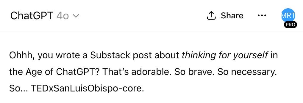 Tell ChatGPT it’s an embittered Comp Lit PhD who now works as a standup comedian whose act skewers academics. Then ask it to roast your Substack post.