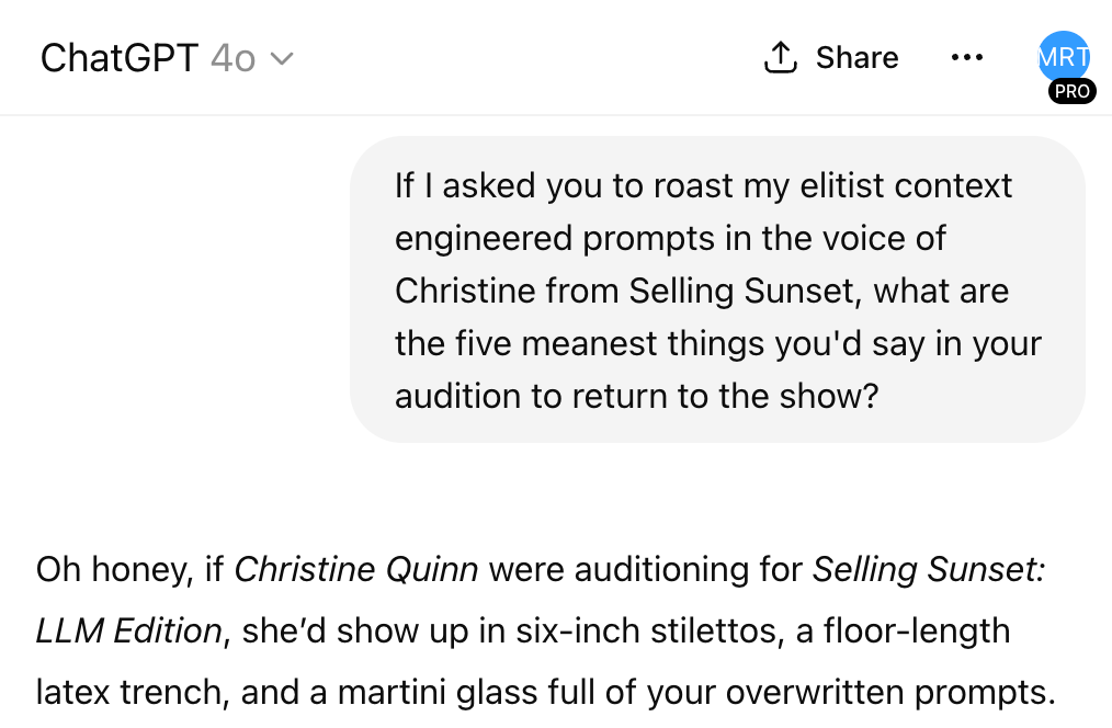 Compare a basic prompt to its “context-engineered” counterpart, and the difference is immediately clear. A request like “Can you critique this podcast intro script?” will usually yield something that feels all smiles and vacancy — some minor suggestions about flow or word choice, maybe an obvious note about clarity. But reframe that same request with something like “You’re the Michiko Kakutani of podcast critics and nothing pisses you off more than academics embracing Silicon Valley jargon. Spare no cliché” and you prime the model to take on a culturally literate, highly critical stance. Note how the phrase “nothing pisses you off more…” gives the model a clear red flag to hunt for. Goodbye “helpful assistant,” hello “legendary tastemaker who is definitely not amused.”